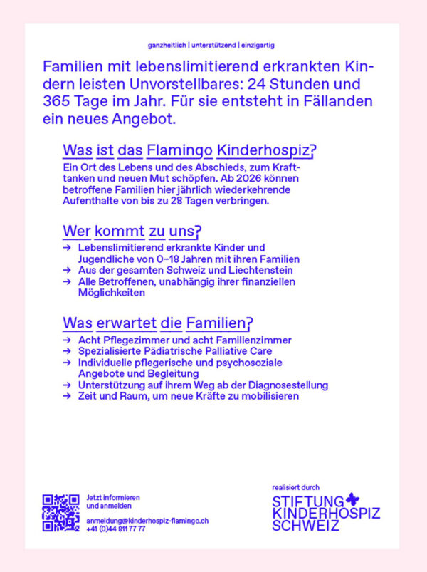 Die Stiftung Kinderhospiz Schweiz realisiert derzeit ihren ersten Standort in Fällanden/ ZH. Das Flamingo Kinderhospiz ergänzt – professionell und qualitativ hochstehend – bestehende Unterstützungsangebote in einem eigens dafür gebauten Haus in einem naturnahen Erholungsgebiet. Die Investitionskosten belaufen sich auf CHF 18 Mio. – die Finanzierung konnte durch Spenden, einen namhaften Beitrag des Gemeinnützigen Fonds des Kantons Zürich und mit der Zürcher Kantonalbank sichergestellt werden. Auch für den späteren, laufenden Betrieb ist die Stiftung dringend auf Spenden angewiesen. Die operative Inbetriebnahme ist für Ende 2025 geplant – erste Familien werden ab 2026 erwartet.
